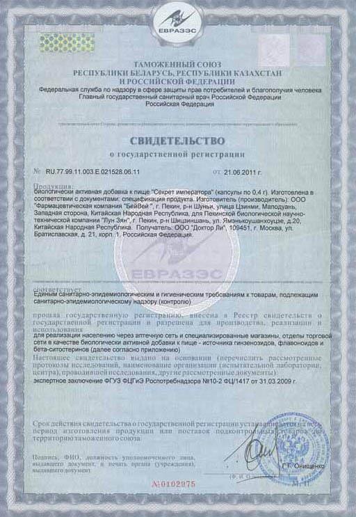Секрет Императора прошел все необходимые процедуры регистрационных и контрольных мероприятий, предусмотренных законодательством РФ.